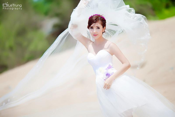 | Thiên thần có gương mặt xinh xắn khiến diễn viên Hàn Quốc cũng phải ghen tỵ: Linh Napie tinh khôi trong màu áo cưới. Khăn voan đội đầu kết hợp với vòng hoa tự nhiên tuyệt xinh. Chiếc nơ hoa màu tím ở vòng eo là điểm nhấn nổi bật của chiếc váy cưới. |
