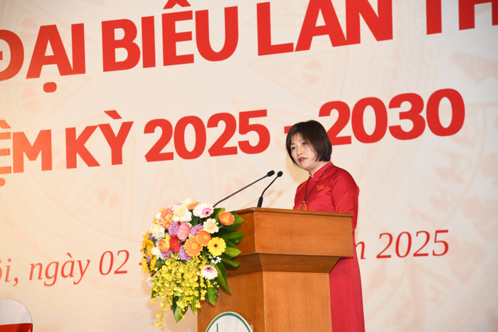 Bí thư Đảng uỷ Nguyễn Thị Hương trình bày Báo cáo kiểm điểm của Ban chấp hành Đảng bộ Trường Đại học Giáo dục khoá III, nhiệm kỳ 2020 - 2025.