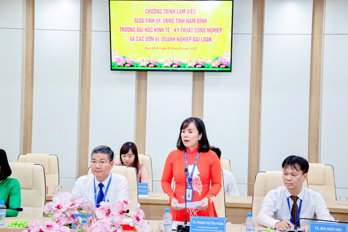 Thay mặt nhà trường TS. Phạm Thị Thu Hoài – Phó Bí thư Đảng ủy, Chủ tịch Hội đồng trường gửi lời cảm ơn sâu sắc tới ông Phạm Gia Túc – Ủy viên Ban chấp hành Trung ương Đảng, Bí thư Tỉnh uỷ tỉnh Nam Định, Lãnh đạo ban Tuyên giáo TW, lãnh đạo Bộ Công thương, Lãnh đạo tỉnh Nam Định cùng tất cả các Sở ban ngành…các vị đại biểu khách quý trong và ngoài nước đã luôn đồng hành, hỗ trợ cho sự phát triển của nhà trường trong thời gian qua. Nhà trường luôn mong nhận được sự quan tâm, tạo điều kiện, sự chỉ đạo sâu sát của các cơ quan ban ngành cấp trên và đặc biệt là tỉnh Nam Định.