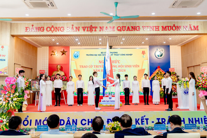 Tiếp theo chương trình là nghi lễ trao cờ truyền thống Uneti giữa các thế hệ sinh viên của Nhà trường.