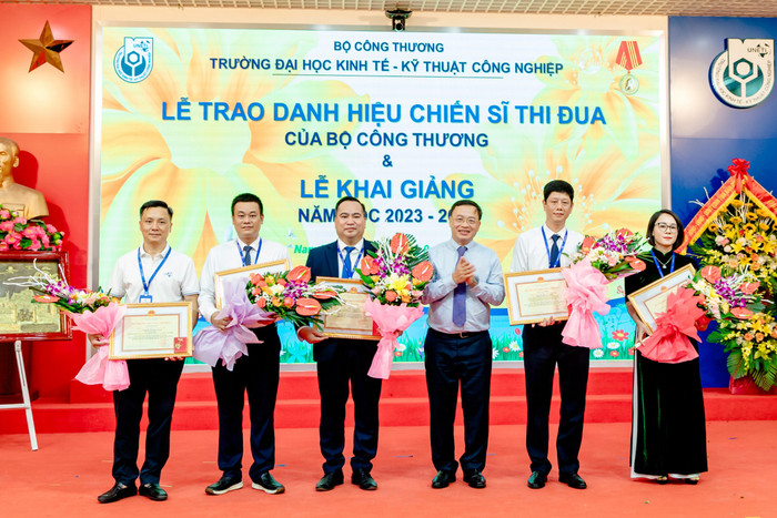 Cũng tại buổi lễ, Trường Đại học Kinh tế – Kỹ thuật Công nghiệp đã vinh danh 25 thủ khoa đầu vào các ngành đào tạo trong trường trong kỳ tuyển sinh năm 2023 vừa qua. Thừa ủy quyền của Hiệu trưởng Nhà trường, Thạc sĩ Lê Mạnh Thắng - Đảng ủy viên, Trưởng phòng Chính trị và Công tác sinh viên lên công bố các Quyết định khen thưởng cho các Tân sinh viên đạt kết quả xuất sắc nhất.