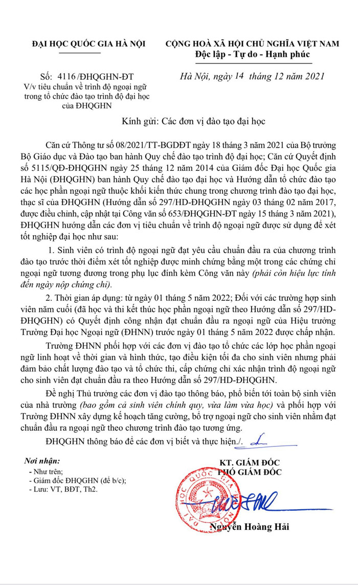 Nhưng mới đây theo Công văn số 4116/ĐHQGHN-ĐT, sinh viên không thuộc diện năm cuối (đã học và thi kết thúc học phần ngoại ngữ theo Hướng dẫn 297/HD-ĐHQGHN) vẫn cần thi chứng chỉ đạt yêu cầu chuẩn đầu ra của chương trình đào tạo.