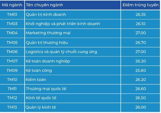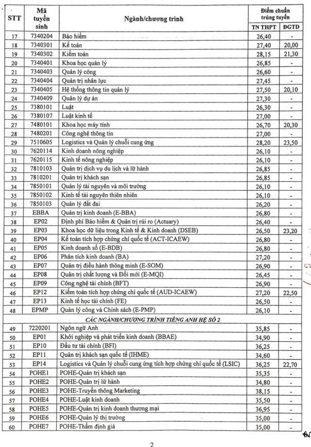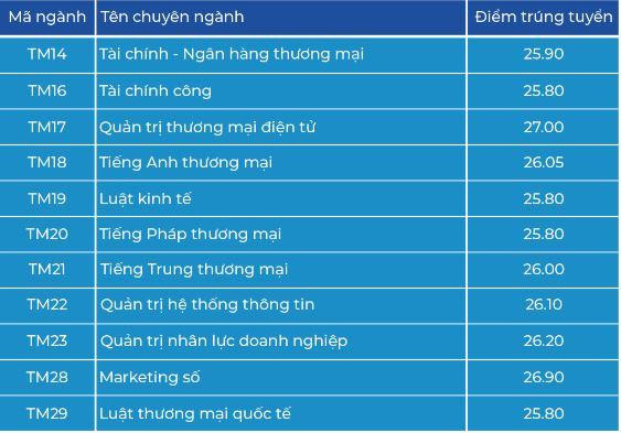 Nhiều ngành của trường này có điểm chuẩn từ 27 trở lên như: Kinh doanh quốc tế, Logistics và quản lý chuỗi cung ứng, Marketing, Kiểm toán, Hệ thống thông tin quản lý, Thương mại điện tử, Công nghệ truyền thông…