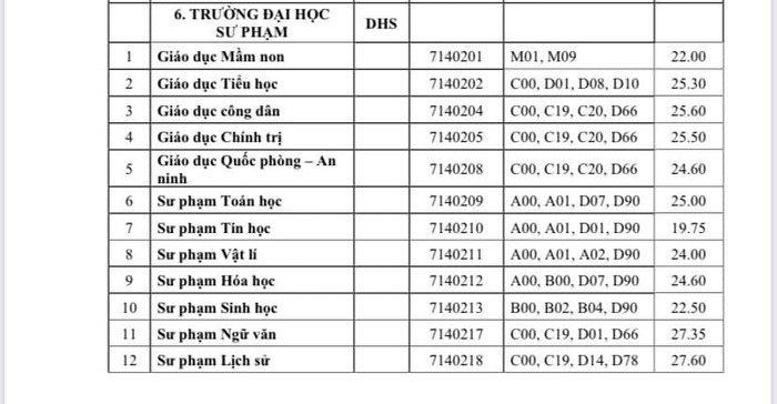 | GD1 | Sư phạm Toán và Khoa học Tự nhiên (Gồm 5 ngành: Sư phạm Toán học; Sư phạm Vật lý; Sư phạm Hóa học; Sư phạm Sinh học; Sư phạm Khoa học Tư nhiên) | 25,58 |