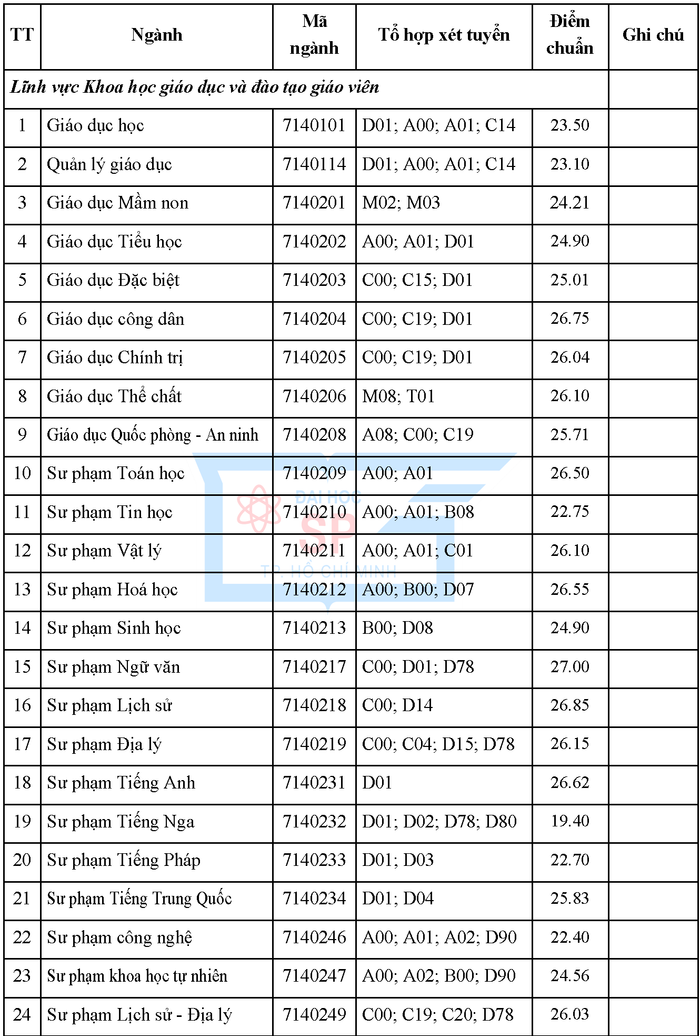 | 26 | 7140212B | SP Hoá học (dạy Hoá học bằng tiếng Anh) | D07 | 26.36 | TTNV <= 14 |