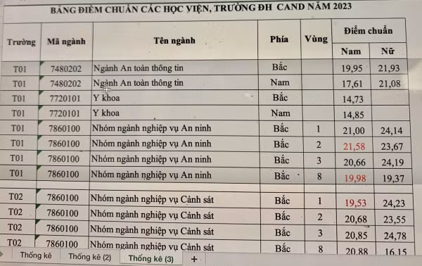 Còn tại Trường Đại học An ninh nhân dân, điểm trúng tuyển Phương thức 3 tuyển sinh đại học chính quy tuyển mới năm 2023, mức điểm chuẩn dao động từ 18.62 đến 21.14 đối với nam; từ 18.1 đến 24.16 đối với nữ - khu vực phía Nam.