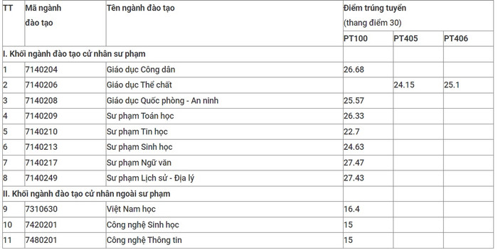 Điểm chuẩn thấp nhất thuộc về các ngành ngoài sư phạm như: ngành Công nghệ Sinh học và nghệ Công nghệ thông tin đều có điểm chuẩn là 15 điểm.