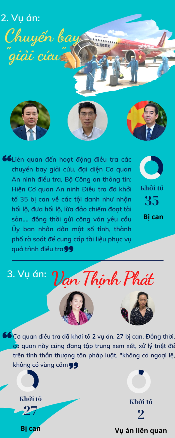Bên cạnh đó, với vụ án "chuyến bay giải cứu", hiện Cơ quan An ninh Điều tra đã khởi tố 35 bị can về các tội danh như nhận hối lộ, đưa hối lộ, lừa đảo chiếm đoạt tài sản…, đồng thời gửi công văn yêu cầu Ủy ban nhân dân một số tỉnh, thành phố rà soát để cung cấp tài liệu phục vụ quá trình điều tra.