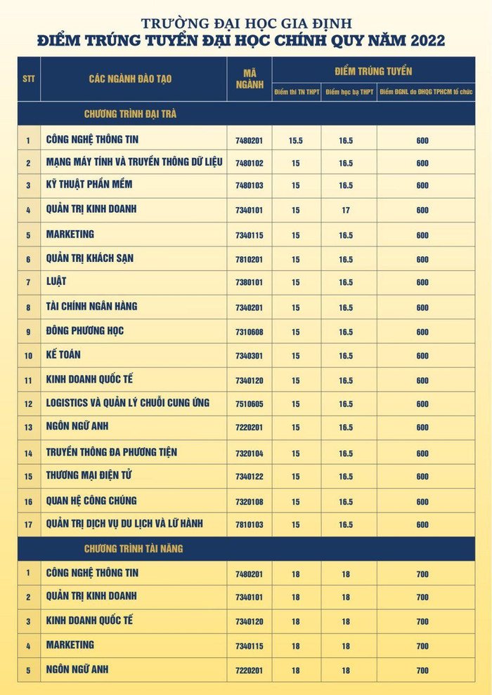 Hội đồng tuyển sinh Trường Đại học Gia Định (GDU) công bố điểm chuẩn trúng tuyển đại học chính quy năm 2022 đối với 17 ngành chương trình đại trà và 05 ngành chương trình tài năng.