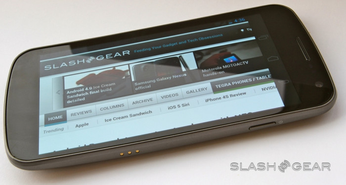 | Galaxy Nexus có giắc cắm tai nghe phía dưới, khác với nhiều bản Galaxy đặt trên đỉnh. Bên cạnh đó, còn có cổng microUSB và mic |