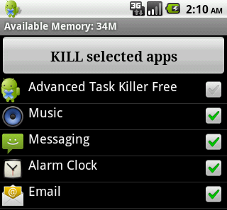 Advanced Task Killer có các chế độ tắt ứng dụng: Safe - an toàn, Aggressive - quyết liệt, và Crazy - triệt để. Thử nghiệm tiến hành với thiết lập ở chế độ Save và đặt chu kỳ đóng các ứng dụng với mỗi nửa giờ; thiết lập này tắt các ứng dụng không mở nhưng vẫn tiêu tốn bộ nhớ. Các nhà phát triển khuyến nghị thiết lập Save, bởi hai thiết lập kia có thể làm cho một số ứng dụng trở nên không ổn định.