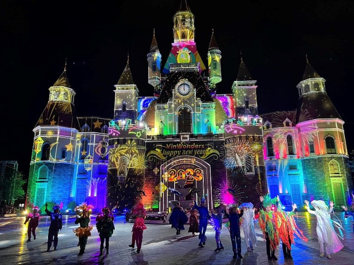 Trong khi đó tại Vinpearl Nha Trang, màn trình diễn thực cảnh Tata show mãn nhãn hàng nghìn du khách với phiên bản chào năm mới 2023. Câu chuyện cổ tích về cuộc đối đầu huyền thoại giữa thiện - ác, hành trình giải cứu công chúa Tata… đã có thêm phần kết đầy rực rỡ với hiệu ứng pháo hoa thắp sáng Quảng trường Thời đại uy nghi tráng lệ.