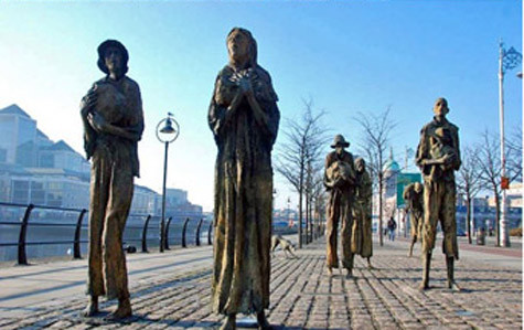 Từ Cao đẳng Trinity, theo đại lộ Westmoreland sẽ ra bờ sông Liffey. Sông như dải lụa mềm mại uốn lượn chia đôi Dublin. Qua bến tàu Dockland, tôi bắt gặp đài tưởng niệm các nạn nhân trong nạn đói 1840. Ở đó có các bức tượng những người đàn ông, phụ nữ đang lê bước về phía bến cảng tìm đường di trú. Một con chó gầy trơ xương lẽo đẽo theo họ. Cảnh tượng quá khứ - một đoàn cả người cả chó dật dờ như những bóng ma – càng nổi bật trên phông nền hiện tại là những đường phố xinh đẹp trải dài, những tòa nhà nguy nga vươn trên nền trời xanh biếc. Một sự kết hợp tưởng đối lập lại trở thành nơi giao thoa hoàn hảo của lịch sử, nơi gặp gỡ giữa quá khứ u tối và thực tại tươi sáng.