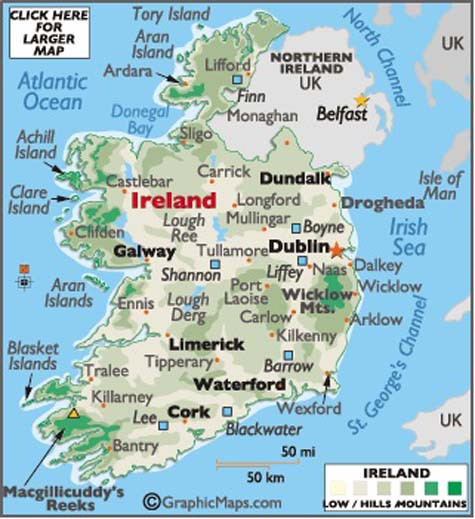 Nature (thiên nhiên): Ireland có địa hình tương đối bằng phẳng theo hình lòng chảo. Vùng trung tâm Ireland chủ yếu là đồng bằng với nhiều sông và hồ lớn, trong đó con sông dài nhất là sông Shannon chảy qua các hồ Lough Ree và Lough Derg. Các dãy núi cao tập trung ngoài bờ biển trong đó ngọn núi cao nhất là đỉnh Carrantouhill, cao 1040 m. Miền trung tâm và miền đông là nơi tập trung nhiều đồng bằng đất đai màu mỡ. Hòn đảo Ai-len còn gọi là hòn đảo ngọc lục bảo bởi vùng đồng quê xanh tươi tuyệt đẹp, kết quả của những lớp đá vôi bên dưới cùng những trận mưa thường xuyên và những màn sương mù.