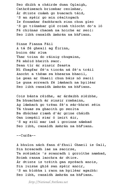 Anthem (bài quốc ca): Mỗi sáng thứ hai được hát vang lời ca:  “Đoàn quân Việt Nam đi chung lòng cứu quốc,..” là niềm vui, niềm vịnh dự của học sinh Việt Nam. Người Ireland cũng vậy. Quốc ca của họ là bài hát Amhrán na bhFiann (bài ca của chiến binh) với lời ca hùng tráng, nhạc điệu trầm bổng ghi lại những năm tháng chiến đấu hào hùng của các thế hệ trước đồng thời thể hiện lòng tự hào, tự tôn dân tộc, sức sống quật cường của con người. Amhrán na bhFiann cất lên có lúc dịu nhẹ như lời tri ân của Thần sông núi, có lúc âm vang, mạnh mẽ như lời của  đại ngàn.