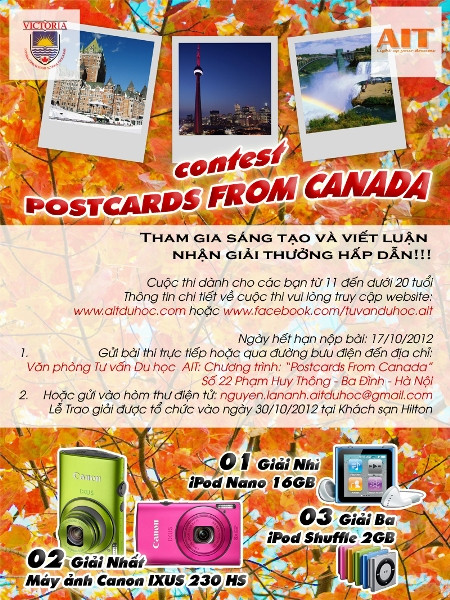 Cuộc thi dành cho tất cả các bạn trẻ Việt Nam từ 11 – 20 tuổi. Thời gian nhận bài dự thi từ ngày 17/9 đến hết ngày 17/10/2012 tại địa chỉ: Văn phòng Tư vấn Du học AIT, số 22 Phạm Huy Thông, quận Ba Đình, Hà Nội hoặc qua email: nguyen.lananh.aitduhoc@gmail.com.