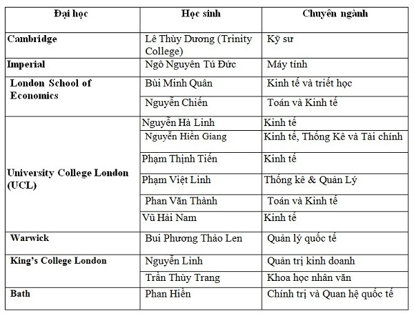 Danh sách một số học sinh Việt Nam đỗ vào các trường ĐH danh tiếng tại Anh: