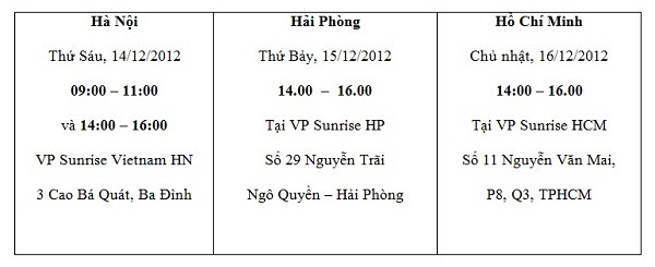 Địa điểm: Văn phòng Sunrise Việt Nam tại Hà Nội, TP.Hồ Chí Minh và Hải Phòng
