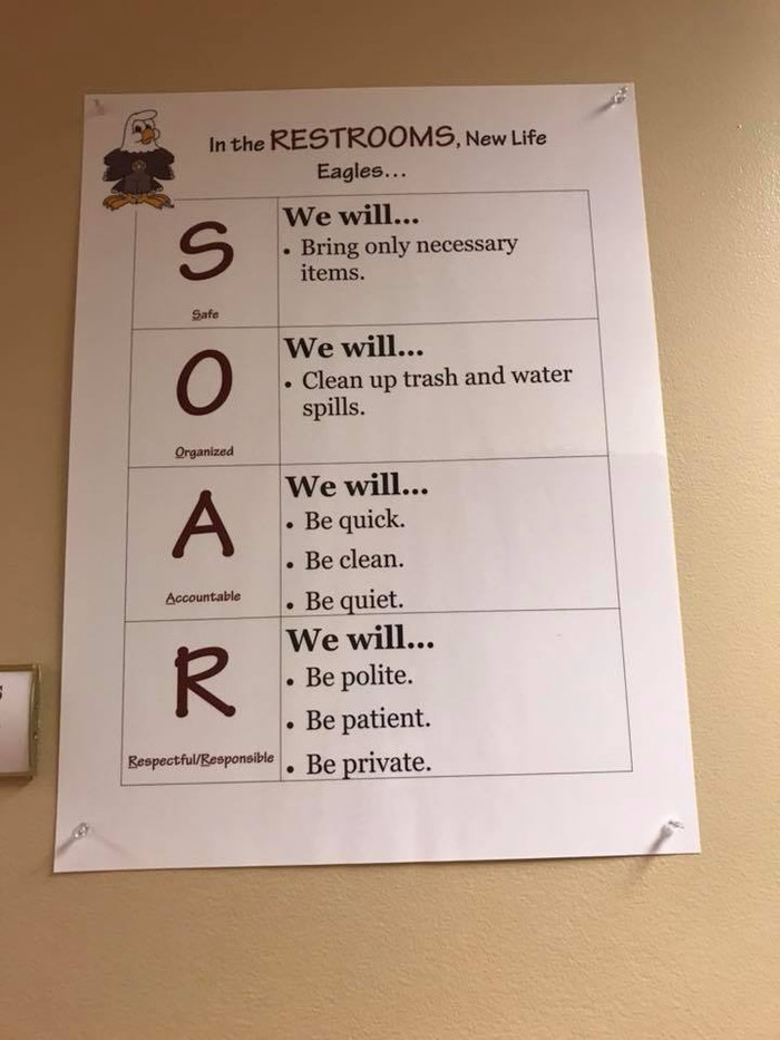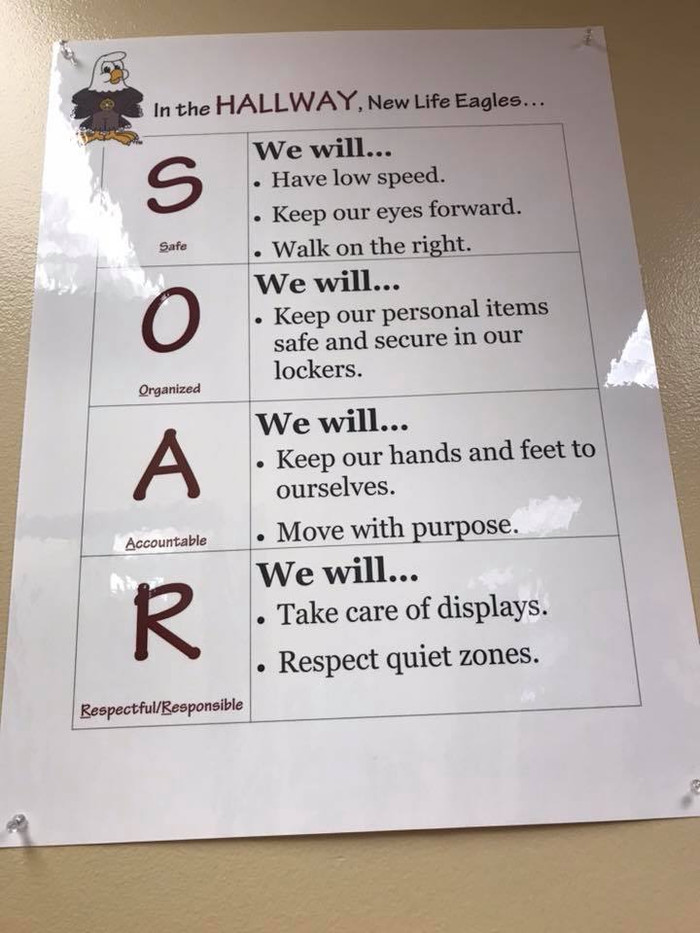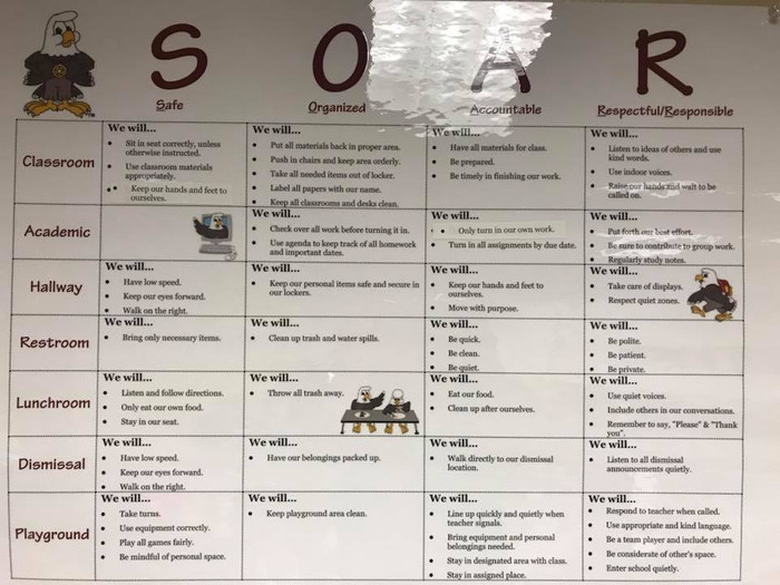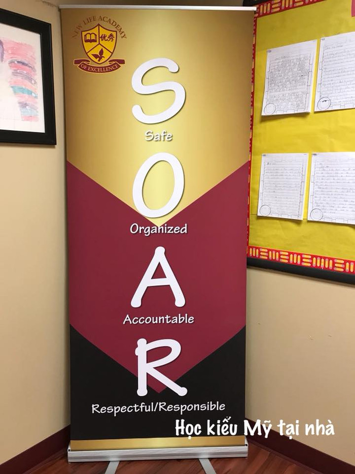 Còn trường nơi tôi mới đến dạy có mascot là đại bàng trắng (bald eagle) nên chọn tên gọi tắt là SOAR (Safe, Organized, Accountable, Responsible).