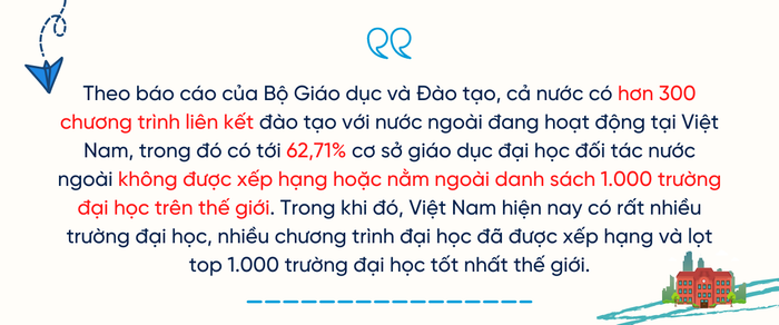 “Tuy nhiên, tất cả các chương trình, bao gồm cả các chương trình liên kết đào tạo được mở ra tại các trường đều được kiểm định, bảo đảm theo các yêu cầu của Luật và Nghị định trên. Dự kiến, trong năm 2023, Bộ Giáo dục và Đào tạo sẽ có thông tư về quản lý và đào tạo của chương trình liên kết đào tạo nước ngoài”, bà Thủy nói.