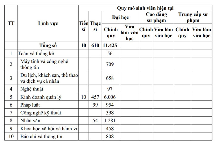 Trong 11.425 sinh viên đại học chính quy thì lĩnh vực Kinh doanh quản lý có quy mô đào tạo lớn nhất (6.006 sinh viên). Lĩnh vực Nhân văn đào tạo 1.281 sinh viên; lĩnh vực Pháp luật có 954 sinh viên; lĩnh vực Báo chí và thông tin có 808 sinh viên; lĩnh vực Máy tính và công nghệ thông tin có 709 sinh viên; lĩnh vực Du lịch, khách sạn, thể thao và dịch vụ cá nhân có 658 sinh viên; lĩnh vực Khoa học xã hội và hành vi có 458 sinh viên; lĩnh vực Công nghệ kỹ thuật có 398 sinh viên; lĩnh vực Nghệ thuật có 97 sinh viên; lĩnh vực Toán và thống kê có 56 sinh viên.