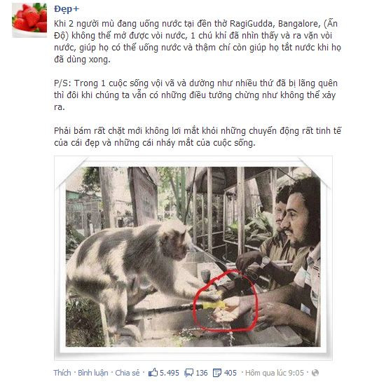 Hành động của chú khỉ đã khiến nhiều facebooker cảm động: "Một việc tưởng chừng đơn giản. Con người có phải ai cũng làm được như vậy"?