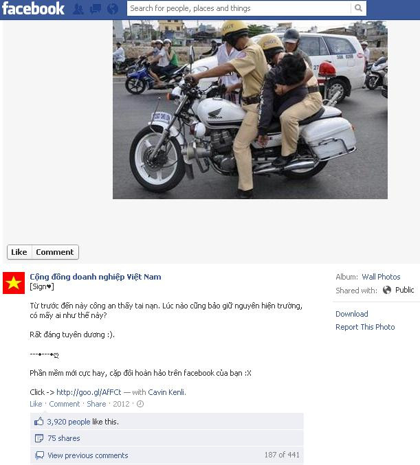 Trên facebook “Cộng đồng doanh nghiệp Việt Nam” vừa mới cho đăng bức hình hai cảnh sát giao thông giúp một thanh niên gặp nạn lên xe và chở đi cấp cứu đã ngay lập tức thu hút 3.920 lượt Like, 75 người chia sẻ cho bạn bè facebook và 403 lời bình luận. Nhiều thành viên cổ vũ nhiệt liệt và hết lời ngợi ca hành động này của hai chiến sĩ trên.