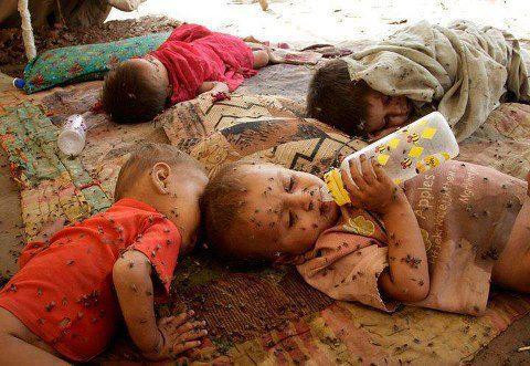 Có thể thấy rõ trong bức hình là bốn đứa trẻ, có đứa thì được phủ tạm bằng một miếng khăn mỏng để tránh sự tấn công của lũ ruồi, có đứa thì cởi truồng nhưng vẫn nằm ngủ ngon lành, lại có em thì một tay vẫn giữ bình sữa nhưng bên trong lại chứa nước trắng chứ không phải sữa, dường như nó cũng ngủ ngon lành giữa bầy ruồi quái ác và tưởng tượng bình nước kia là một bầu sữa ngọt lành.