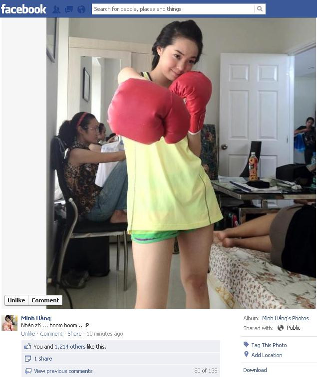 Chỉ sau 9 phút sau khi đăng lên vào chiều qua, bức hình này của Minh Hằng đã hút 2.402 lượt Like, 316 lời bình luận của fan hâm mộ. Nhìn dáng của Hằng Heo (biệt hiệu trên facebook của cô) cũng rất ra dáng một võ sĩ quyền anh. Dưới bức ảnh của mình, Minh Hằng thách đấu: “Nhào zô…boom, boom”.