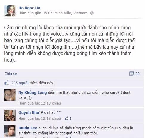 Sau khi chia sẻ dòng cảm xúc: 'Cảm ơn những lời khen của mọi người dành cho mình cũng như các HLV trong The Voice. Và cũng cảm ơn cả những lời nói bảo rằng chúng tôi diễn, giả tạo...vì nếu tôi mà diễn được thế thì từ nay tôi nhận lời đóng film...(thế mà bấy lâu nay cứ nhủ lòng mình diễn không được đừng đóng film kẻo thành thảm họa)...' đã có rất nhiều comment đồng tình với Hà Hồ.
