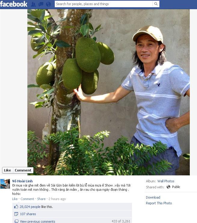 Bức hình Hoài Linh chụp bên một gốc mít non, đáng ra phải buồn vì mít non chưa bán được thì nhìn gương mặt của danh hài này rõ là hơn hớn không hợp với lời tự sự phía dưới bức hình chút nào: “Đi mua vài ghe mít đem về Sài Gòn bán kiếm lời bù lỗ mùa mưa ế show. Vậy mà tới vườn toàn mít non không. Thôi ráng ăn mắm, ăn rau cho qua ngày đoạn tháng. Hixhix”.