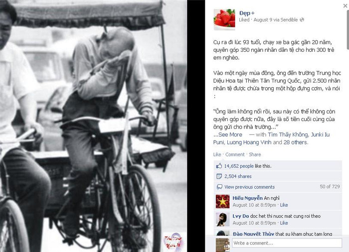 14.650 like của cư dân facebook cùng 727 lời bình luận và 2.504 lượt người chia sẻ câu chuyện nhân văn xúc động và đầy tình người trên. Bạn Lvy Do xúc động trào cả nước mắt: “Đọc hết thì nước mắt cũng rơi theo”, facebook Đào Nguyệt Thùy chia sẻ: “Thật sự khâm phục tấm lòng của cụ”. “Cảm động quá! Cụ già vẫn còn lo được như vậy mà chúng ta thì như thế nào? Làm được điều đáng quý đấy không? Chia buồn vì cụ đã ra đi nhưng có lẽ điều đó lại làm cụ an nghỉ, đỡ vất vả với cuộc sống hiện nay” là những dòng tâm sự của thành viên Kathy Nhien.
