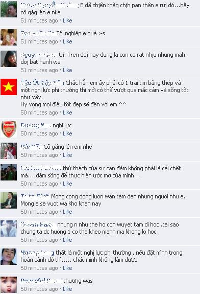 Một bạn có nickname Thích Là Yêu Luôn cảm phục ý chí của cậu bé khi chứng kiến bức hình: “Chỉ biết lặng người trước tấm hình này”. Facebook Như Vậy Nhé cảm kích và khích lệ: “Nghị lực vươn lên hoàn cảnh, chẳng biết làm gì ngoài việc chúc em mạnh khỏe và học giỏi”. Một thành viên khác chia sẻ cảm nghĩ của mình: “Em không giàu có, không thành công như bao người khác. Nhưng em có 1 ý chí không chịu khuất phục. Làm bao người phải thán phục. Như thế em đã thành công. Em sẽ trở thành người giỏi nhất trong những người giỏi nhất, tôi ước được nói với em những lời này”.