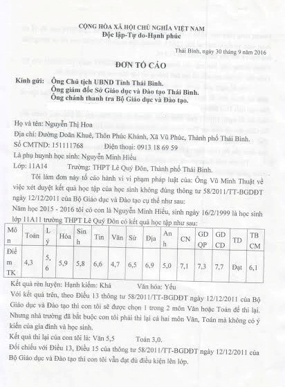 Theo đơn trình bày của bà Hoa “ Năm học 2015-2016, con tôi (Nguyễn Minh Hiếu_PV) có kết quả học tập như sau: