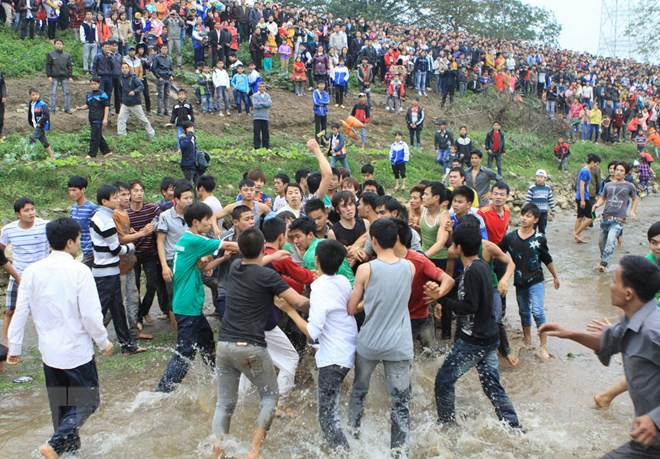 | Trai tráng các làng tham gia lễ hội cướp phết với hy vọng giành được Phết sẽ may mắn cả năm. (Ảnh: Nguyễn Thủy/TTXVN). |