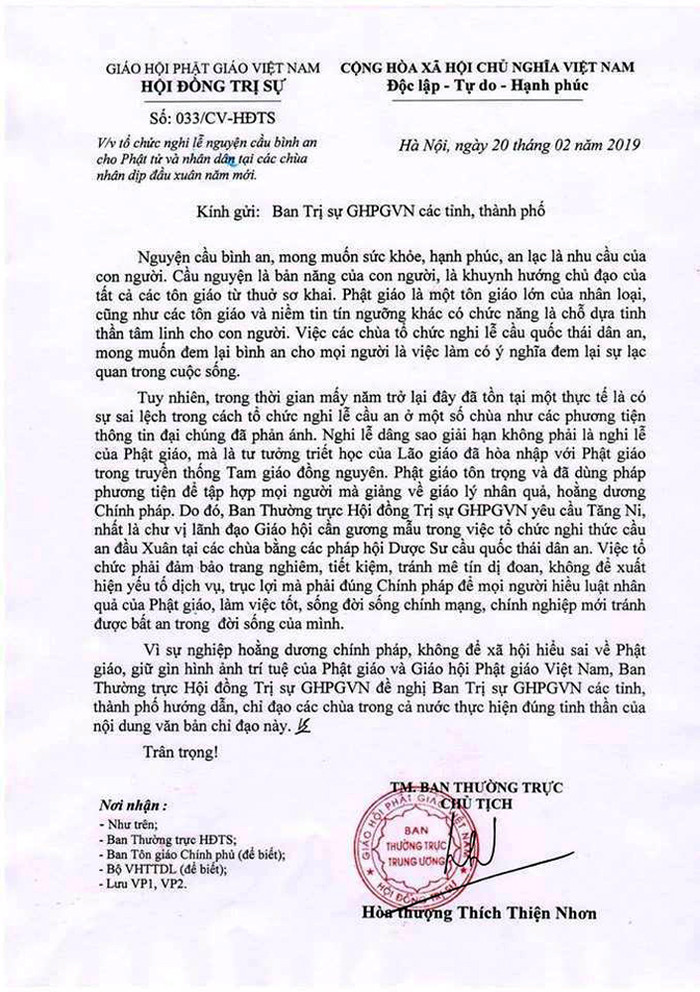 Ngày 20/2/2019, Hội đồng Trị sự Giáo hội Phật giáo Việt Nam đã ban hành văn bản số 033/CV-HĐTS gửi Ban Trị sự Giáo hội Phật giáo Việt Nam các tỉnh, thành phố về việc tổ chức nghi lễ nguyện cầu bình an cho Phật tử và nhân dân tại các chùa nhân dịp đầu Xuân mới.