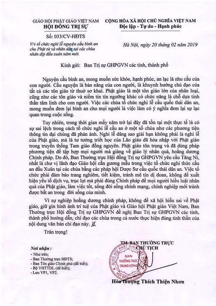 Văn bản do Hòa thượng Thích Thiện Nhơn (Chủ tịch Hội đồng Trị sự Giáo hội Phật giáo Việt Nam) ký ban hành với nội dung như sau: