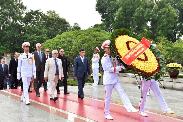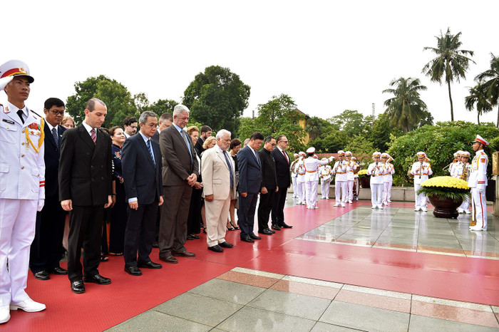 Sau khi vào Lăng viếng Chủ tịch Hồ Chí Minh, đoàn đã tới đặt vòng hoa, dâng hương, tưởng niệm các anh hùng liệt sĩ tại Đài Tưởng niệm các anh hùng liệt sĩ trên đường Bắc Sơn.