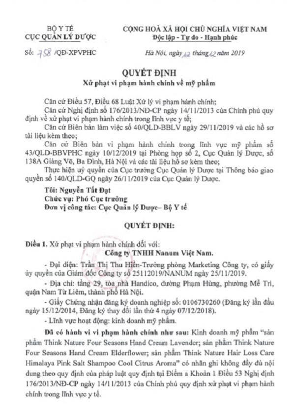 Theo thông tin từ Cục Quản lý dược (Bộ Y tế), Công ty Trách nhiệm hữu hạn Nanum Việt Nam (địa chỉ: tầng 29, tòa nhà Handico, đường Phạm Hùng, phường Mễ Trì, quận Nam Từ Liêm, thành phố Hà Nội), đại diện là bà Trần Thị Thu Hiền-Trưởng phòng Marketing Công ty đã có hành vi vi phạm hành chính, khi kinh doanh mỹ phẩm “sản phẩm Think Nature Four Seasons Hand Cream Lavender; sản phẩm Think Nature Four Seasons Hand Cream Elderflower; sản phẩm Think Nature Hair Loss Care Himalaya Pink Salt Shampoo Cool Citrus Aroma” có nhãn ghi không đầy đủ nội dung theo quy định của pháp luật.