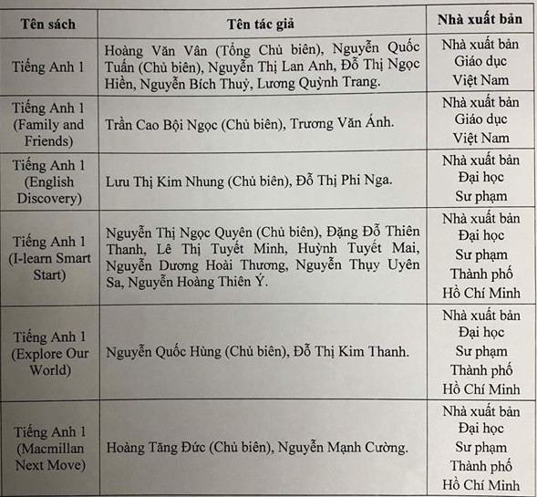 Theo đó, có hai cuốn sách của Nhà xuất bản giáo dục Việt Nam, một cuốn sách của Nhà xuất bản đại học sư phạm và 3 cuốn của Nhà xuất bản đại học sư phạm thành phố Hồ Chí Minh.