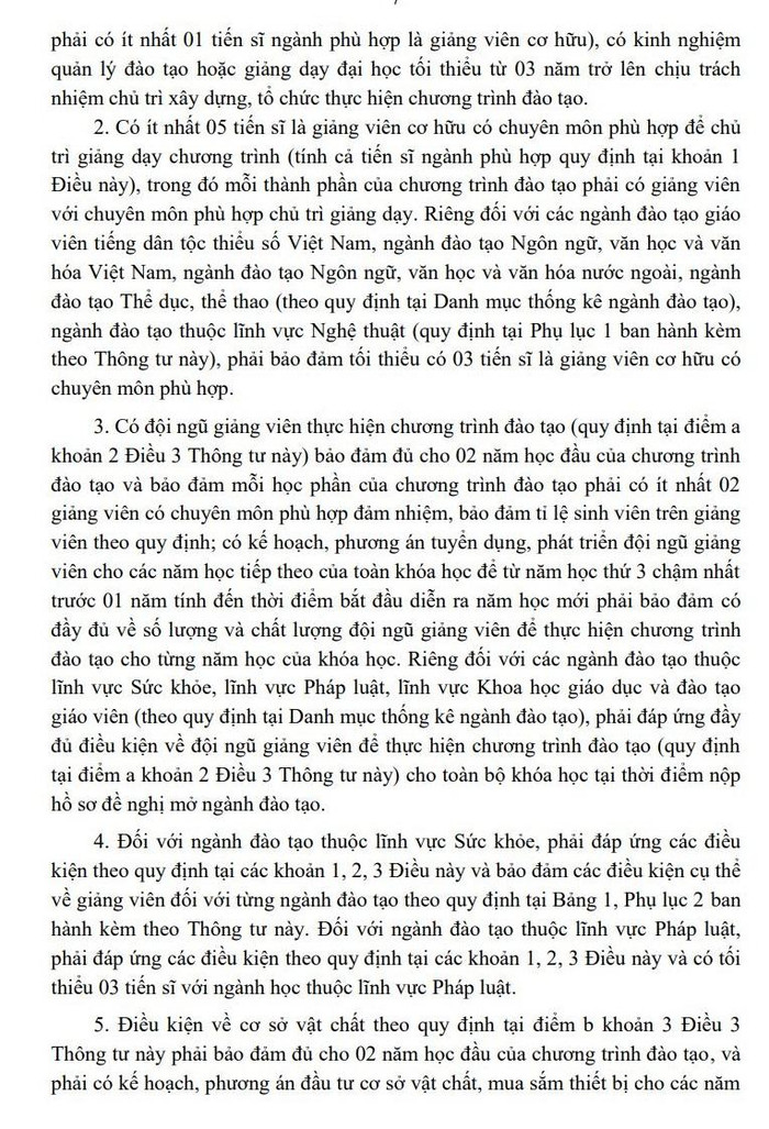 Đối với lĩnh vực Sức khỏe, lĩnh vực Pháp luật và nhóm ngành đào tạo giáo viên yêu cầu phải có đầy đủ điều kiện về đội ngũ giảng viên theo quy định khi nộp hồ sơ đề nghị mở ngành đào tạo.