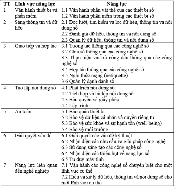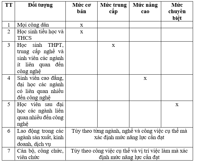 Theo đề xuất có tính tham khảo của Ngân hàng Thế giới [4] thì mức độ cần đạt về năng lực số đối với các đối tượng khác nhau theo khung năng lực số nêu trên có thể là như sau: