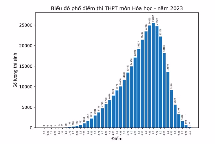 Kết quả phân tích phổ điểm thi tốt nghiệp môn Hóa học của cả nước năm 2023 cho thấy: Có 328,117 thí sinh tham gia thi bài thi Hóa học, trong đó điểm trung bình là 6.74 điểm, điểm trung vị là 7.0 điểm; điểm số có nhiều thí sinh đạt nhất là 7.5 điểm. Số thí sinh có điểm <= 1 là 14 (chiếm tỷ lệ 0.004%); số thí sinh đạt điểm dưới trung bình là 38,375 (chiếm tỷ lệ 11.7%).