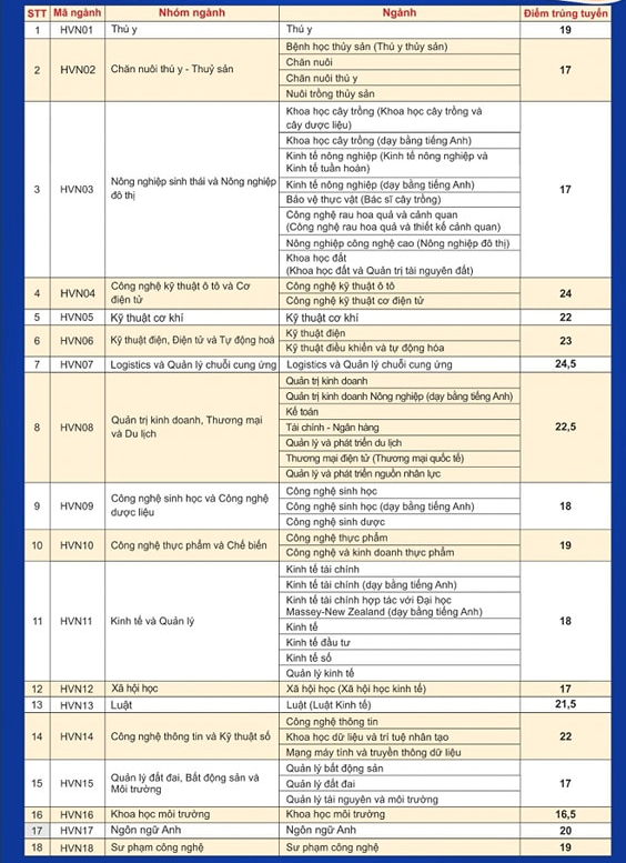 Học viện Nông nghiệp Việt Nam, điểm chuẩn ngành cao nhất là Logistics và quản lý chuỗi cung ứng với 24,5 điểm. Ngành Khoa học môi trường có điểm chuẩn thấp nhất là 16,5 điểm. Nhóm ngành Nông nghiệp sinh thái và Nông nghiệp đô thị; Chăn nuôi thú ý - Thủy sản đều có điểm chuẩn là 17 điểm. Cụ thể như sau: