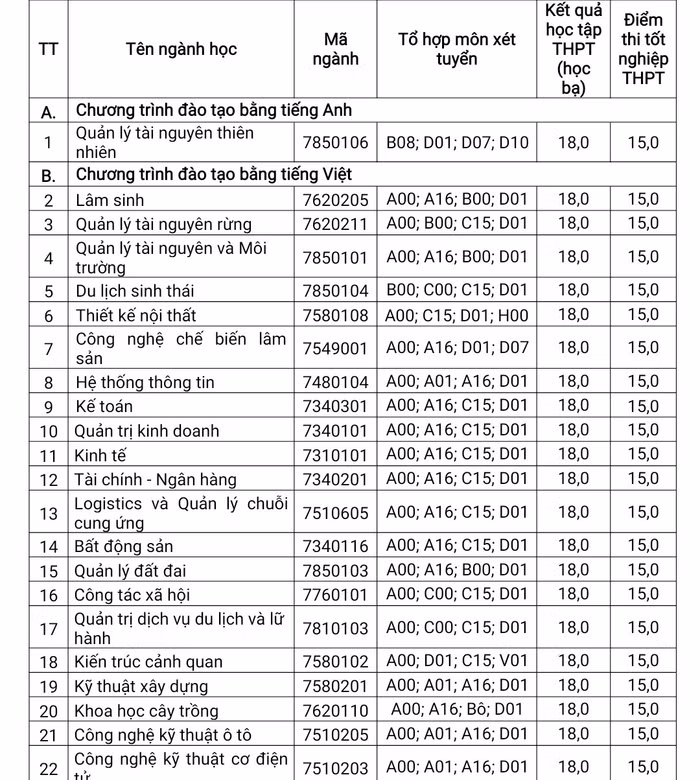 | Điểm chuẩn các ngành Trường Đại học Nông lâm - Đại học Huế. |