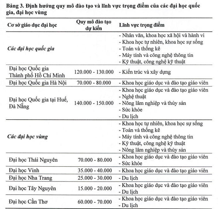 Định hướng phát triển quy mô đào tạo và lĩnh vực trọng điểm của các đại học quốc gia, đại học vùng: