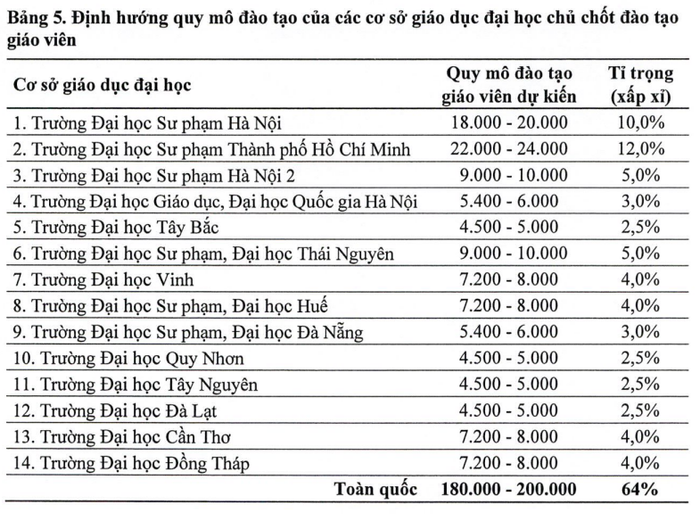 Trong đó, các cơ sở giáo dục đại học chủ chốt đào tạo giáo viên bao gồm 02 trường đại học sư phạm trọng điểm và 12 cơ sở giáo dục đại học khác trực thuộc Bộ Giáo dục và Đào tạo, các đại học quốc gia và đại học vùng, giữ vai trò nòng cốt trong mạng lưới. Các cơ sở này chiếm khoảng 64% quy mô đào tạo giáo viên toàn quốc, phục vụ nhu cầu sử dụng của từng vùng và cả nước.