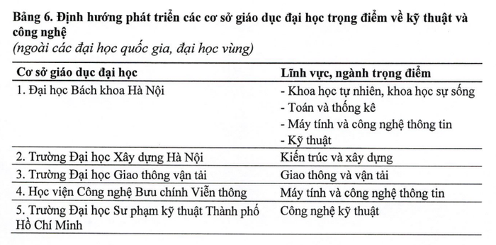 Bên cạnh đó, 5 cơ sở giáo dục đại học công lập hàng đầu về kỹ thuật – công nghệ sẽ được nâng cấp thành các trường trọng điểm quốc gia, trong đó Đại học Bách khoa Hà Nội hướng đến nhóm hàng đầu châu Á.