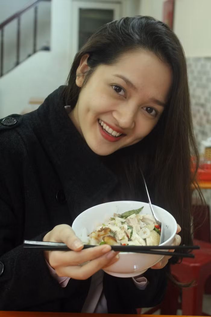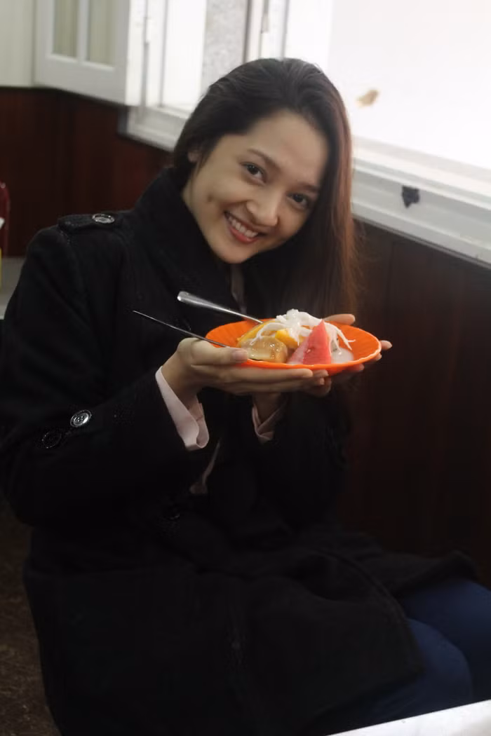 | Cô nàng hot girl của The Voice thưởng thức kem đĩa trái cây giữa trời lạnh của Đà Lạt. |