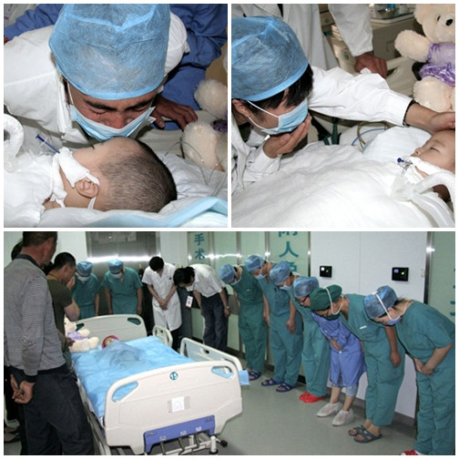 Các bác sĩ và nhân viên bệnh viện cùng người nhà đã thực hiện một hành động thiêng liêng, đầy xúc động: nghiêng mình cúi đầu tiễn biệt bé Hy vọng lần cuối trước khi bé được chuyển tới phòng mổ để lấy tạng.